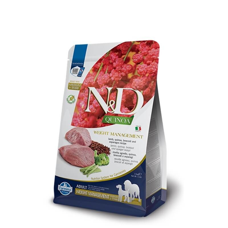 N&D Quinoa Weight Management es un alimento dietético completo para perros destinado a la reducción del peso corporal excesivo.