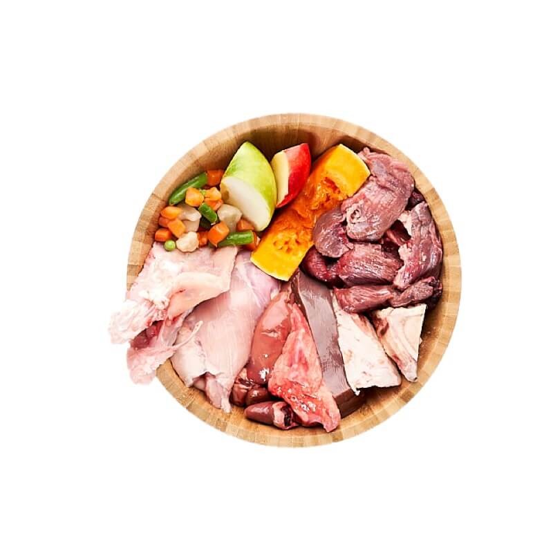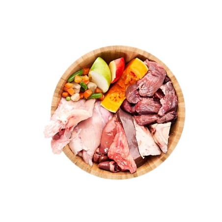 Equilibrio perfecto de carnes blancas y rojas con todos los beneficios de las nutricionalmente ricas vísceras de ternera. Ayuda a seguir facilitando la transición a la dieta barf gracias a su contenido en pollo.